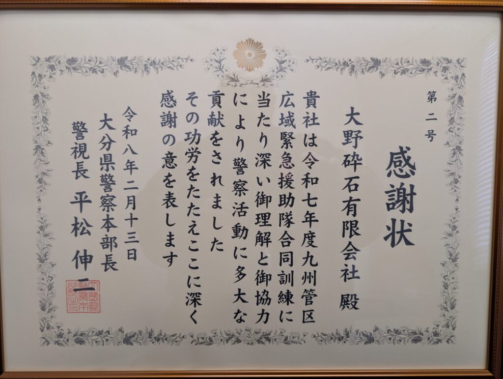 今回の感謝状は、先日2月9日〜10日に弊社戸次工場にて実施された「令和7年度九州管区広域緊急援助隊合同訓練」において、会場提供および円滑な訓練運営への協力が評価されたものです。